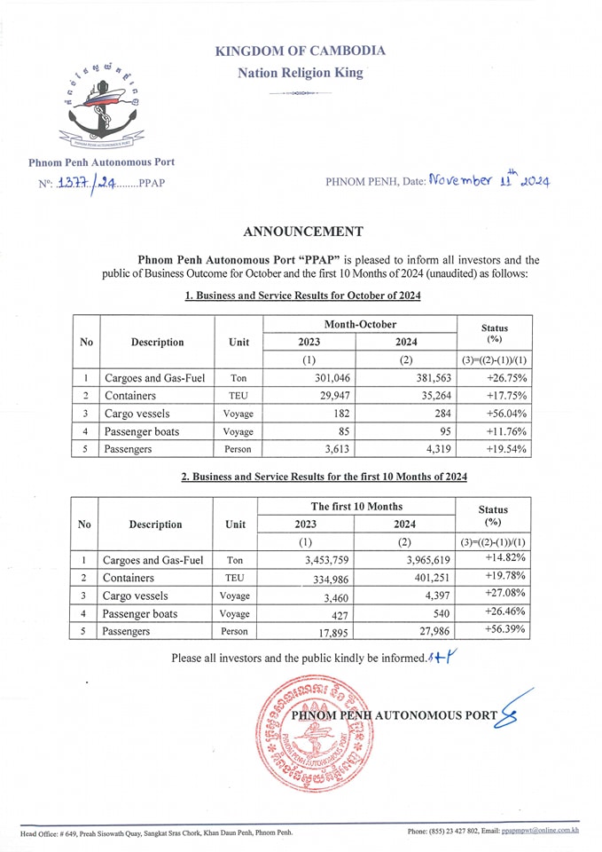 Phnom Penh Autonomous Port "PPAP" is pleased to inform all investors and the public of Business Outcome for October and First 10 Months of 2024 (unaudited) as follow: