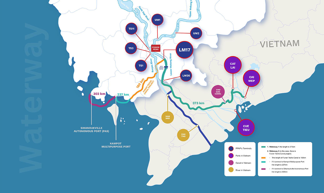 PPAP uses Mekong river as a primary navigation route, connecting all of its terminals to ports in Vietnam for transshipment of container cargo, break bulk cargo, and general cargo. Additionally, it also supports passenger cruise operations along the river. The access distance to PPAP’s port (LM26) is about 300-375 km from the Cuu Tieu entrance mouth, part of South China Sea, and about 100km from Kaam Samnar, Cambodia-Vietnam border gate. The access channels to the port taken by the Bassac/Hau Giang and Mekong/Tien Giang River.