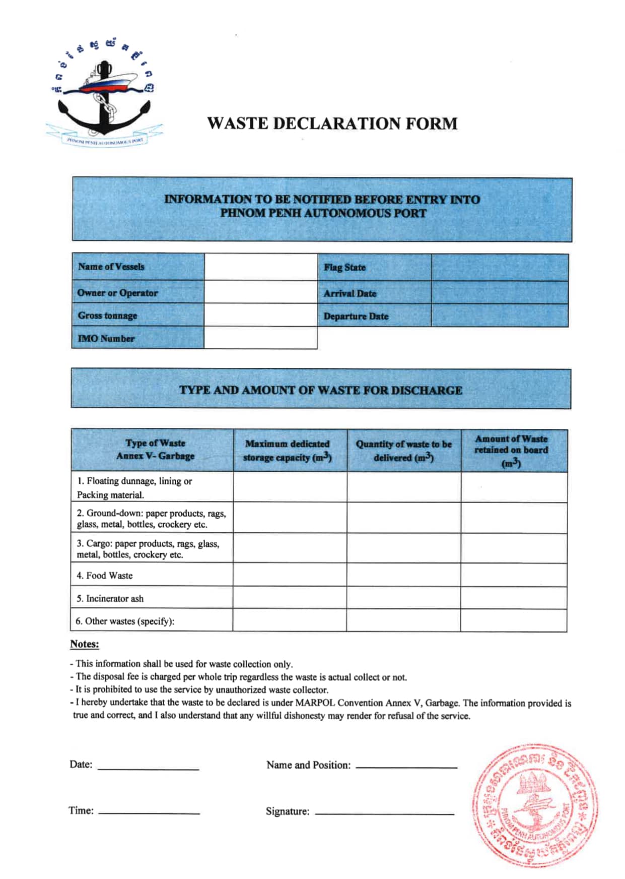ក.ស.ភ. មានសេចក្តីសោមនស្សរីករាយក្នុងការប្រកាសទៅកាន់អតិថិជនដ៏ឲ្យបានថា ស្របតាមបទប្បញ្ញត្តិក្នុងស្រុក និងអនុសញ្ញាអន្តរជាតិដែលមានគោលបំណងការពារបរិស្ថានកំពង់ផែ ក៏ដូចជាការលើកកម្ពស់ការអំពាវនាវ និងអនាម័យនៃតំបន់កំពង់ផែ ក.ស.ភ. នឹងអនុវត្តដំណើរការផ្លូវច្បាប់សម្រាប់សេវាកម្មប្រមូលសំរាមសម្រាប់នាវាទាំងអស់ និង កុងតឺន័រ/កប៉ាល់ដឹកទំនិញទូទៅ រួមជាមួយនឹងការអនុវត្តថ្លៃប្រមូលសំរាម។