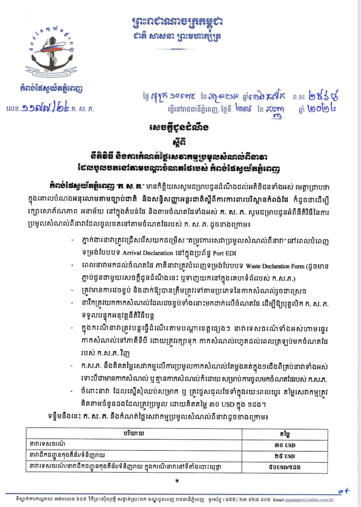 និតិវិធី និងការកំណត់ថ្លៃសេវាកម្មប្រមូលសំណល់ពីនាវាដែលចូលចតនៅតាមបណ្តាចំណតផែរបស់ ក.ស.ភ