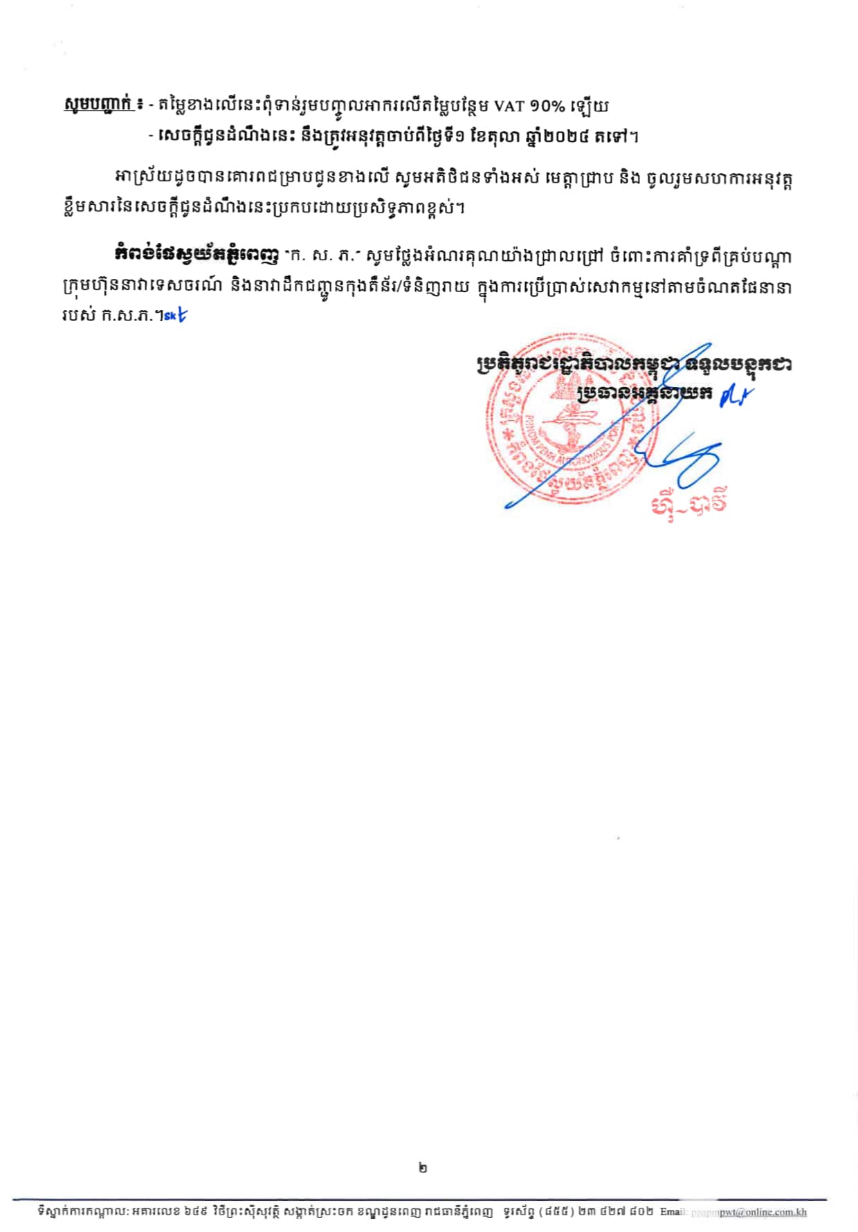 សេចក្តីប្រកាសនេះនឹងត្រូវបានអនុវត្តចាប់ពីថ្ងៃទី១ ខែតុលា ឆ្នាំ២០២៤ តទៅ។ សូមមើលឯកសារភ្ជាប់សម្រាប់ព័ត៌មានបន្ថែម។