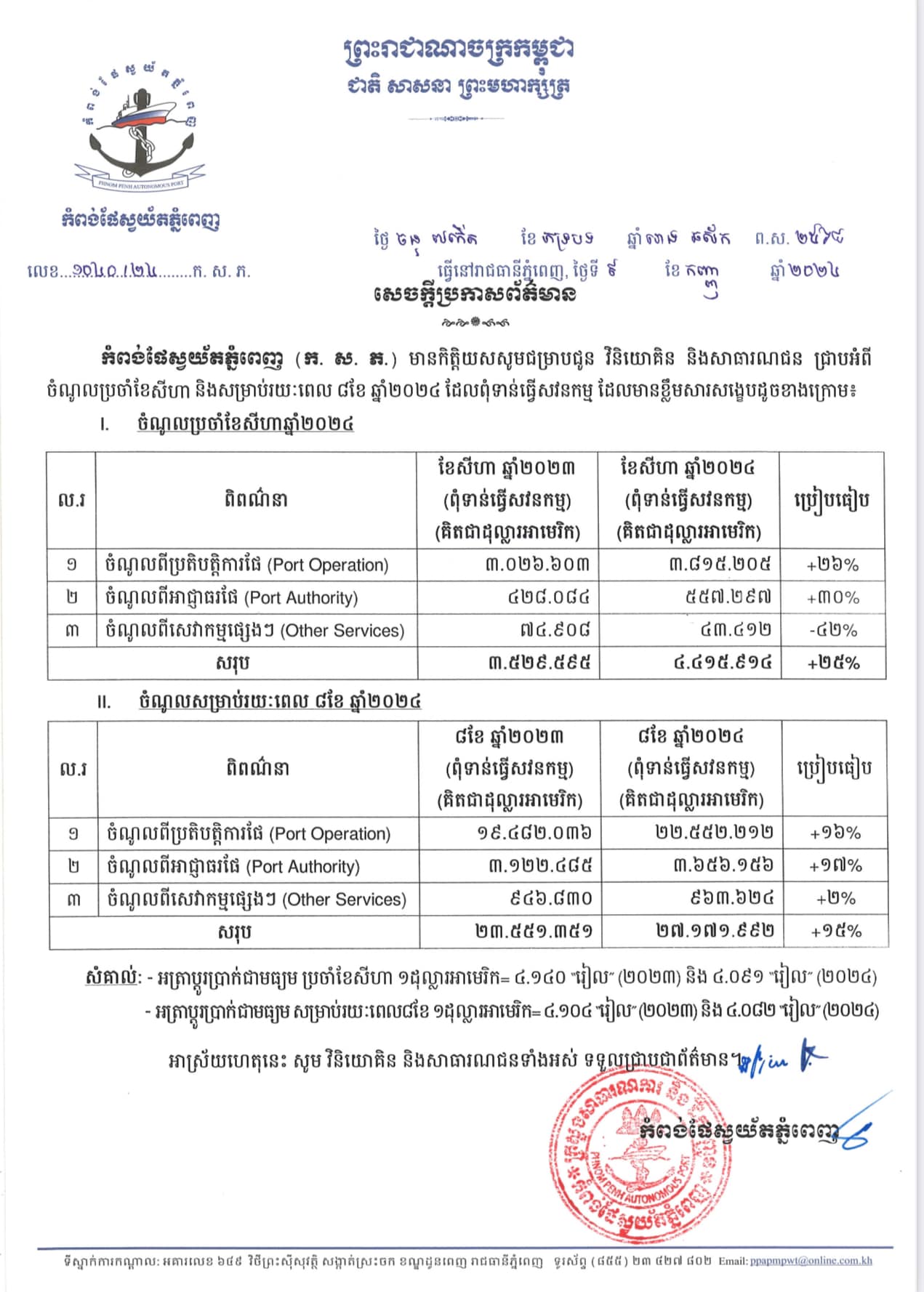កំពង់ផែស្វយ័តភ្នំពេញ (ក.ស.ភ.) មានកិត្តិយសសូមជម្រាបជូនវិនិយោគិន និងសាធារណជនជ្រាបអំពីលទ្ធផលការងារអាជីវកម្ម សេវាកម្ម អនុវត្តសម្រាប់ខែសីហា និងអនុវត្តសម្រាប់ ៨ខែដើមឆ្នាំ២០២៤ (ពុំទាន់ធ្វើសវនកម្ម) ដែលមានខ្លឹមសារសង្ខេបដូចខាងក្រោម។ អាស្រ័យហេតុនេះ សូមវិនិយោគិន និងសាធារណជនទាំងអស់ទទួលជ្រាបជាព័ត៌មាន។