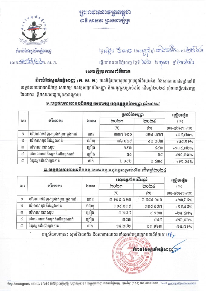 កំពង់ផែស្វយ័តភ្នំពេញ (ក.ស.ភ.) មានកិត្តិយសសូមជម្រាបជូនវិនិយោគិន និងសាធារណជនជ្រាបអំពីលទ្ធផលការងារអាជីវកម្ម សេវាកម្ម អនុវត្តសម្រាប់ខែកញ្ញា និងអនុវត្តសម្រាប់ ៩ខែដើមឆ្នាំ២០២៤ (ពុំទាន់ធ្វើសវនកម្ម) ដែលមានខ្លឹមសារសង្ខេបដូចខាងក្រោម។ អាស្រ័យហេតុនេះ សូមវិនិយោគិន និងសាធារណជនទាំងអស់ទទួលជ្រាបជាព័ត៌មាន។